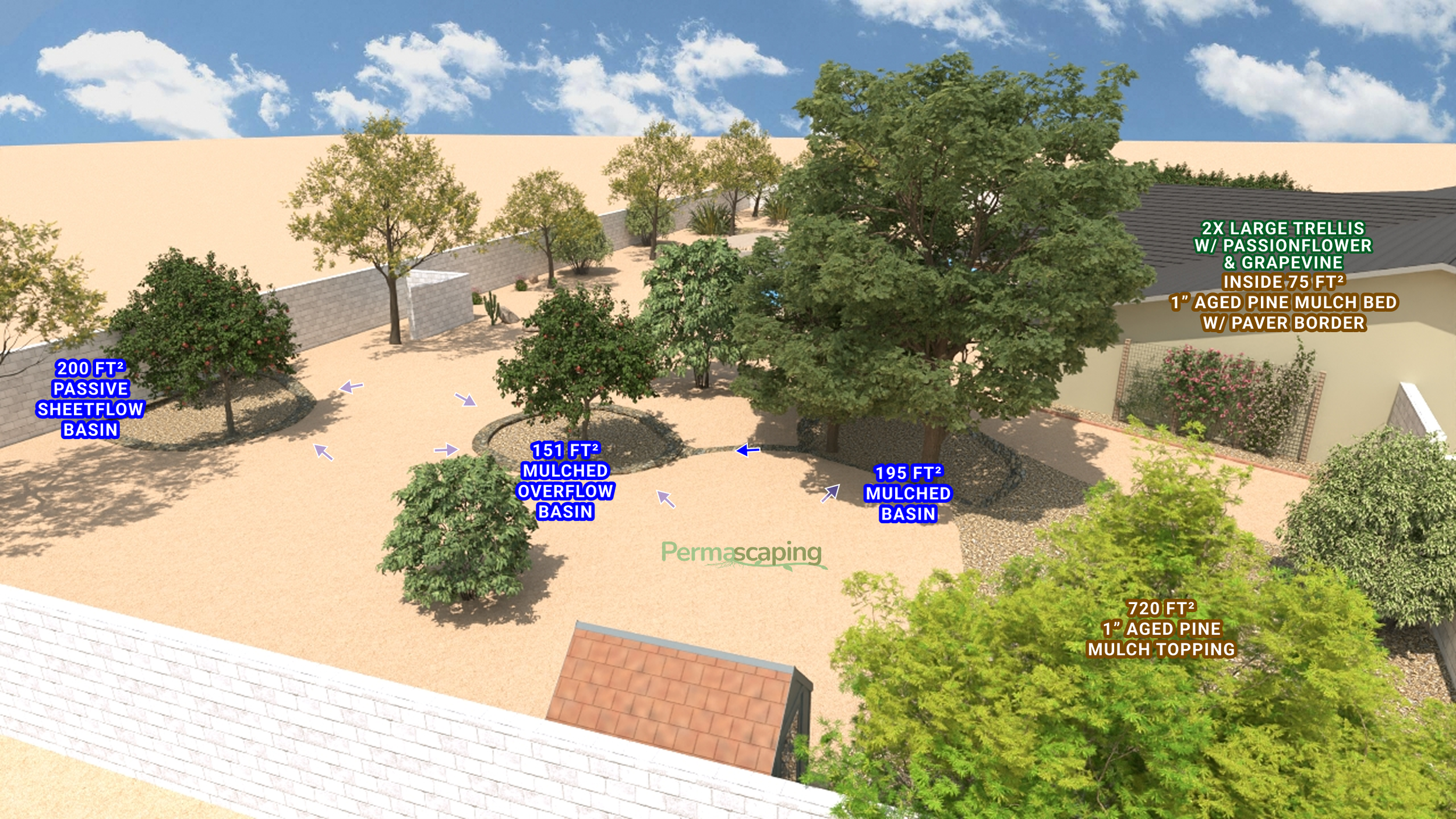 With these strategies, we not only took advantage of the 3,600 square feet of backyard roof catchment, but also the several thousand more square feet of passive sheet flow in the surrounding landscape areas that are slightly elevated. This is how we desert-dwelling rainwater harvesters turn a 1” rain event into many, many inches of rain concentrated in specific areas!