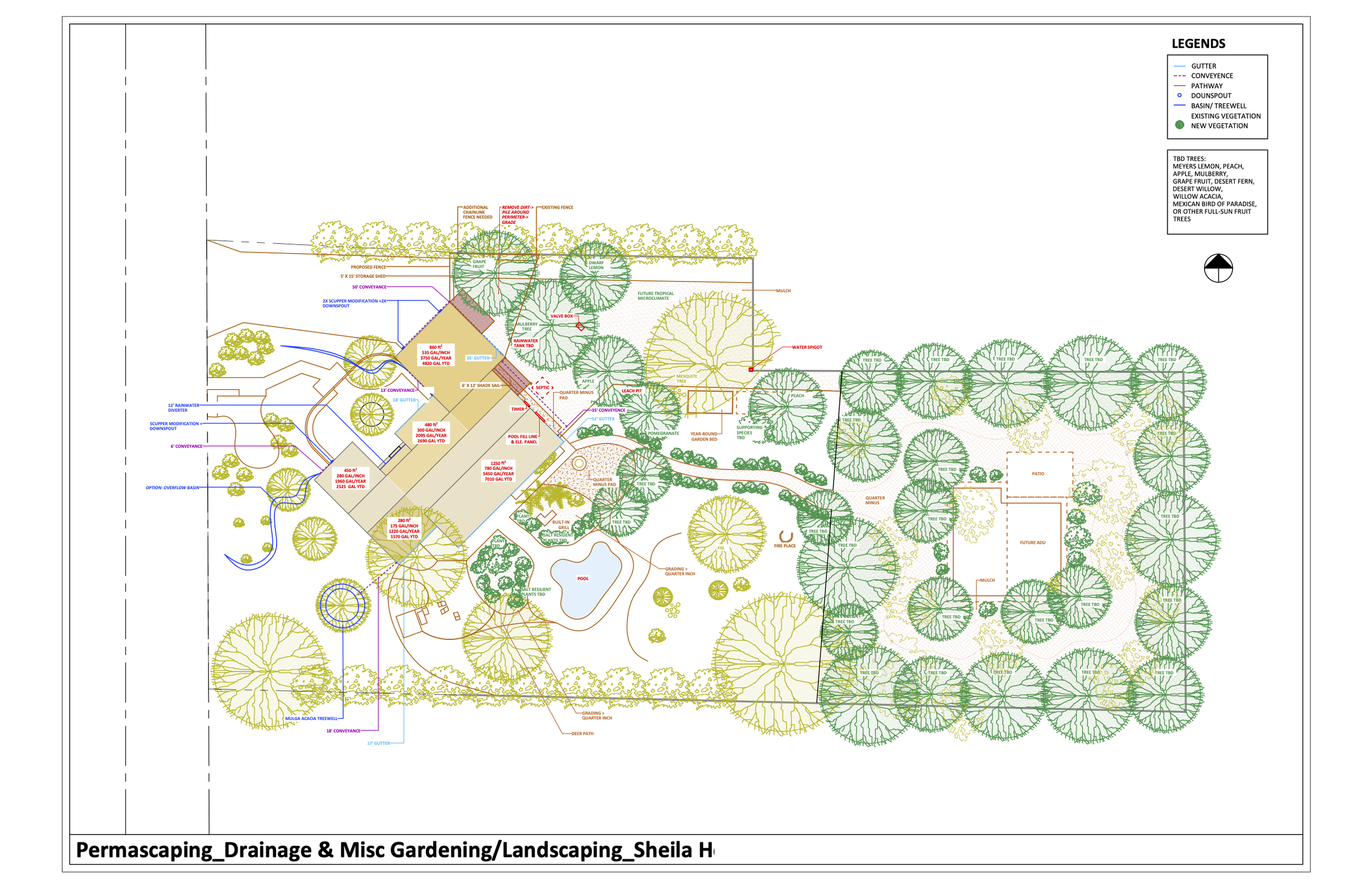 Based on Google Earth data, drone footage and an on-site visit from the G.O.A.T. of Phoenix permaculture landscaping himself Clint Culberson, we designed a comprehensive, permaculture-informed system that eliminates drainage issues and redirects that stormwater into a future above-ground tank, as well as ground-level basins around a diversity of desert-adapted fruit trees including:
